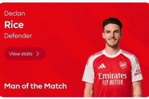 体育资讯12月28日讯 阿森纳在本轮英超2-1击败布莱顿,赖斯当选全场最佳。