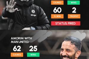 阿莫林执教曼联:62场25胜,胜率40%,0座冠军,安全