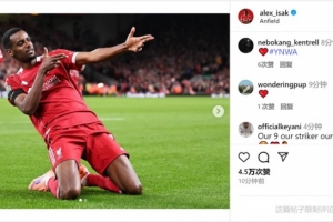 此役伊萨克斩获红军生涯首球,他在社媒晒出比赛照片,庆祝球队取胜+攻入处子球。