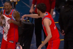 赛后,切特·霍姆格伦直接用矿泉水泼华莱士以表庆祝。