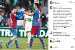 佩德里社媒晒出与布斯克茨在巴萨的合照,配文:“我知道这一刻终会到来,尽管接受这个现实并不容易。你即将挂靴,布斯克茨,但你的足球将永远留存,还有你对巴萨和生活的见解,我很幸运能与你共度三年时光。”