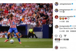 格列兹曼为马竞攻入199球,在西甲比赛中打进199球,仅差1球达成200球里程碑,赛后他在社交媒体上晒出比赛照片,配文:“199⚽️”