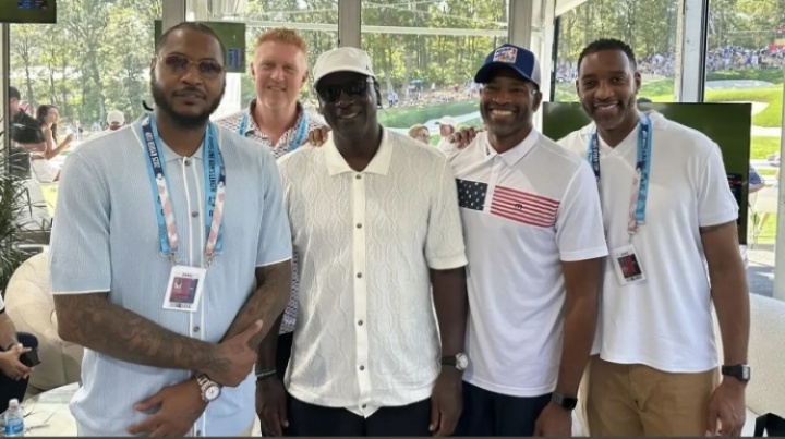 j体育资讯9月29日讯 今日,NBA传奇球星迈克尔-乔丹、卡梅隆-安东尼、特雷西-麦克格雷迪、文斯-卡特和布莱恩-斯卡拉布赖恩现身贝斯佩奇黑球场,参加莱德杯第三天的比赛!