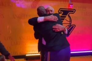 热火官推晒出赛前詹姆斯和莱利拥抱的瞬间,两人曾在热火共事四年。