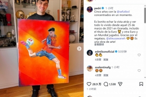 全文摘要:西班牙中场佩德里获赠一幅主题画作,并晒于社媒。他感慨这凝聚了五年国家队时光,从2021年首秀至今,共同经历欧洲杯夺冠及世界杯征程。佩德里感谢这份厚礼,称其为艺术品。