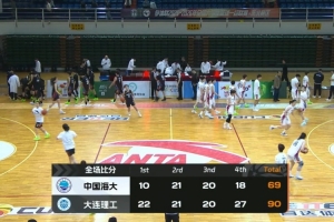 末节双方拉锯交替拿分,李沛奇和汤景越互飙三分,中国海大虽然咬住比分但始终无法翻越10分这道坎,而大连理工顶住压力依靠李沛奇和张天骐的接连进球很快重新拉开15分左右的领先。这之后大连理工牢牢控制两位数比分并一路领先到最后。最终,大连理工大学90-69大胜中国海洋大学拿下比赛。