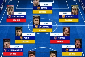 巴萨与马竞合体最贵阵容:梅西、格列兹曼领衔,亚马尔、佩德里在列