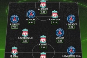 体育资讯4月8日讯 欧冠淘汰赛巴黎对阵利物浦的比赛即将打响,数据网站Whoscored也盘点了两队球员在本赛季欧冠场均评分最高阵容(至少出场500分钟),具体如下: