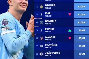 体育资讯4月13日讯 德转更新了足坛中锋身价情况,哈兰德和姆巴佩均两亿欧,伊萨克、登贝莱均1亿欧紧随其后。