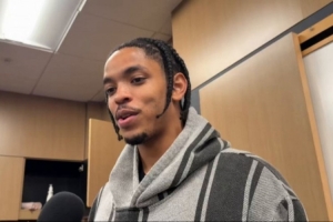 在今天的比赛中,米诺特多次在哨响后封盖对手的投篮,主帅乔-马祖拉随后满意地走上前去。对此,米诺特表示:“我们不吃这一套。你绝对不能让对手看到球穿过篮筐。”