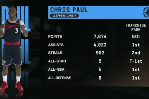 在快船效力期间,保罗共得到7674分(队史第6),送出4023次助攻(队史第1),完成902次抢断(队史第2),5次入选全明星(并列队史第1),5次入选最佳阵容(队史第1),6次入选最佳防守阵容(队史第1)