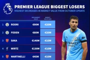 体育资讯10月17日讯 德转更新英超身价,其中跌的最多的是罗德里和福登,他们身价都下降了2000万欧。