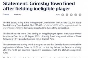 英格兰足球联赛(EFL)委员会,作为联赛杯的管理委员会,今日对格林斯比镇足球俱乐部处以20000英镑的罚款,其中10000英镑将暂缓执行至2025/26赛季结束,因其违反了比赛规则。