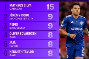 1.马修斯-席尔瓦(卡拉巴赫):15