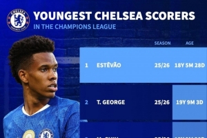 全文摘要:德国转会市场公布了切尔西队史欧冠最年轻进球者排名,其中埃斯特旺以18岁5月28天的年龄居首。前五名均为20岁以下的年轻球员,乔治和吉乌分列二、三位,里斯-詹姆斯与奥多伊紧随其后。