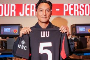体育资讯10月24日讯 AC米兰官博更新动态,晒出影星吴彦祖与米兰球衣的合照,球衣印号是5号的“WU”。