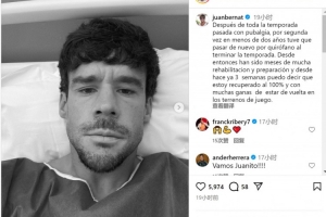 体育资讯10月24日讯 西班牙32岁左后卫贝尔纳特更新社媒动态,表示自己从伤病中康复。