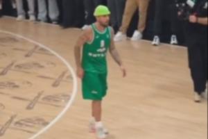画面中比伯身穿一件绿色6号球衣,头戴“小绿帽”,连连得分。