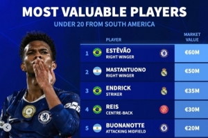 全文摘要:切尔西新星埃斯特旺以6000万欧元身价领跑《转会市场》统计的南美U20球员身价榜。皇马的马斯坦托诺(5000万)和恩德里克(3500万)分列二、三位。前十名中,切尔西与皇马各占两席,球员多来自欧洲豪门,身价从1400万至6000万欧元不等,展现了南美年轻才俊的巨大潜力。