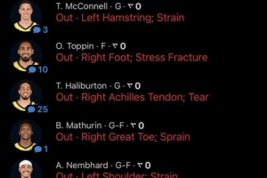 这场比赛堪称超级残阵,一共起名球员缺阵,分别是哈利伯顿、马瑟林、托平、内姆哈德、麦康纳、卡梅隆-琼斯和麦克朗。