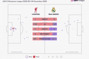 利物浦在本场比赛中将皇马的预期进球(xG)限制在仅0.45,几乎没有给对手机会。