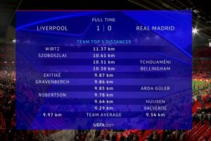 全文摘要:利物浦欧冠1-0战胜皇马。赛后官方跑动数据显示,利物浦全队跑动距离(平均9.97km)高于皇马(9.54km)。其中,利物浦的维尔茨以11.37km居首,皇马的琼阿梅尼和贝林厄姆均跑超10.5km。