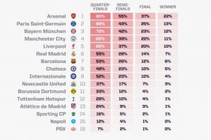 欧冠夺冠概率:阿森纳超22%独一档,巴黎拜仁曼城利物浦皇马2-6位