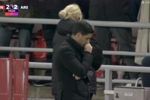 体育资讯11月9日讯 阿森纳本轮2-2战平桑德兰,补时桑德兰绝平,场边镜头给到了阿尔特塔。