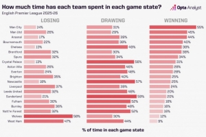 体育资讯11月12日讯 本赛季英超已经结束了11轮的争夺,OPTA统计了各队处在领先、落后以及均势时间占比情况,其中曼城平均每场比赛领先时间最长,达到总比赛时间的55%,而水晶宫和切尔西平均每场处在落后情况下的比赛时间最短,仅为总比赛时间的13%。