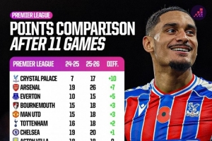 体育资讯11月14日讯 Opta统计了英超球队本赛季前11轮比赛与上赛季同期积分的变化,并列出榜单,水晶宫+10分提升最大,阿森纳+7分,利物浦-10分。