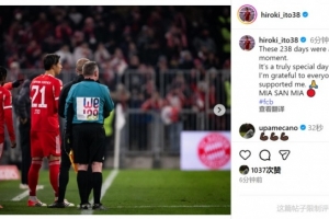 伊藤洋辉赛后在社交媒体上写道:“这238天,都是为了这一刻。 对我来说这真的是一个特别的日子。 感谢所有支持过我的人🙏MIA SAN MIA🔴”