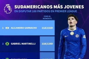 全文摘要:德国转会市场统计了南美球员达成英超百场最年轻年龄排名。阿根廷新星加纳乔以21岁152天高居榜首,巴西球员马丁内利(22岁125天)和里沙利松(22岁303天)分列二、三位,凯塞多与热苏斯紧随其后。