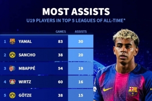 全文摘要:德国转会市场统计了五大联赛U19球员的助攻榜。亚马尔以83场30助高居榜首,展现惊人创造力。桑乔(38场20助)、姆巴佩(54场19助)等年轻球星紧随其后,这份榜单记录了未来巨星在19岁前的卓越助攻表现。