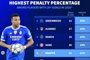 全文摘要:根据《转会市场》统计,在2025年五大联赛进球超20的球员中,格林伍德以22球和36%的点球占比领跑榜单。阿尔瓦雷斯、拉莫斯、凯恩等名将紧随其后,而哈兰德和登贝莱的点球占比较低,分别为11%和10%。