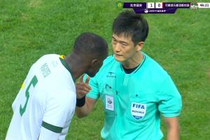 执法本场比赛的韩国裁判高亨进半场出示了三张黄牌,回看VAR改判点球。