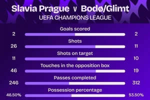 此役布拉格斯拉维亚射正11次,博德闪耀射正10次。据Squawka统计,这是近10个赛季第3场双方都射正10+的欧冠比赛,前2场为2017年莱比锡vs贝西克塔斯、2020年萨尔茨堡vs拜仁。