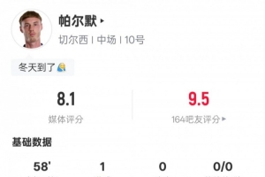 全文摘要:切尔西1-0埃弗顿,帕尔默建功。他在英超第16轮表现亮眼,1次射门即破门,并送出2次关键传球,获评8.1分。全场比赛触球37次,传球成功率近八成,展现出出色的进攻组织能力。