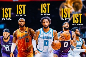 他在场均出场时间、总出场时间、总得分、场均得分、投篮出手数、罚球出手数、防守篮板总数等数据都是队内第一。
