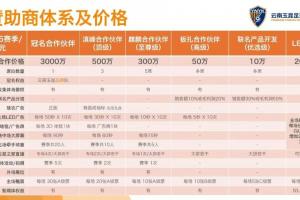其中,2026赛季云南玉昆设立了1个冠名合作伙伴席位,参考价值3000万元,而其他各档赞助席位则从10万-500万元不等。