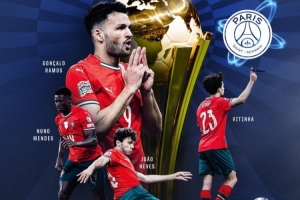 葡萄牙国家队官方发布海报,祝贺效力巴黎的葡萄牙籍球员若奥·内维斯、维蒂尼亚、努诺·门德斯和贡萨洛·拉莫斯随队夺冠,这也是他们随巴黎和葡萄牙国家队今年夺得的第7个冠军,包括:法甲冠军、法国杯冠军、法国超级杯冠军、欧冠冠军、欧超杯冠军、洲际杯冠军以及欧国联冠军。