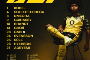 1-科贝尔、4-施洛特贝克、8-恩梅查、9-吉拉西、10-布兰特、13-格罗斯、23-埃姆雷·詹、23-斯文森、25-聚勒、26-莱尔森、27-阿德耶米