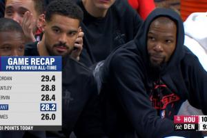 杜兰特今天目前得到31分,最后时刻又回到场上,场均得分可能还会上涨。