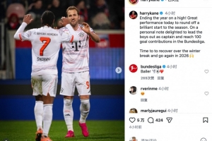 全文摘要:拜仁4-0客胜海登海姆,凯恩进球并社媒发文。他称以胜利收官2025,欣喜以队长身份带队,达成德甲参与100球里程碑。凯恩表示将利用冬歇期恢复,2026年再接再厉。