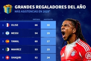 全文摘要:德国转会市场统计了2025年球员俱乐部与国家队助攻榜。奥利塞以30次助攻位居榜首,梅西29次紧随其后。亚马尔(27次)、马赫雷斯(25次)等球员也位列榜单前列。