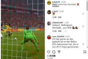 登贝莱老东家多特官方更新社媒动态,晒出登贝莱效力多特期间精彩进球的视频,配文:“现在他已是金球奖得主。”
