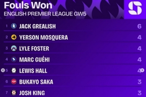全文摘要:英超第5轮数据出炉,埃弗顿的格拉利什以6次造犯规高居榜首。狼队的耶森-莫斯克拉等4名球员以4次并列次席,萨卡等5人则以3次位列第三。