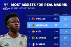 全文摘要:皇马6-1大胜摩纳哥后,维尼修斯欧冠助攻数升至队史第二,仅次于C罗。他在75场欧冠中已送出29次助攻,效率惊人,超越了传奇劳尔,成为皇马队史助攻榜上的新标杆。