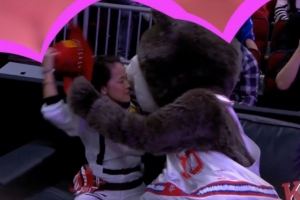 火箭主场迎战马刺,暂停是kiss cam环节,镜头给到一位穿着马刺球衣的球迷和他的女伴,随后火箭吉祥物火箭熊叫来保安“逮捕”这位球迷,并和他的女伴热吻。