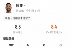 全文摘要:英超第27轮焦点战,阿森纳4-1战胜热刺。门将拉亚表现出色,贡献全场最多的4次扑救,评分8.3。他49次触球,传球成功率达62.1%,并完成3次高球拦截,是球队取胜的关键功臣。