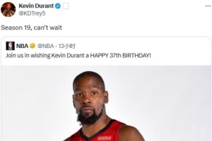 杜兰特转发了NBA官方的推文,并配文道:迫不及待开启生涯第19个赛季了。